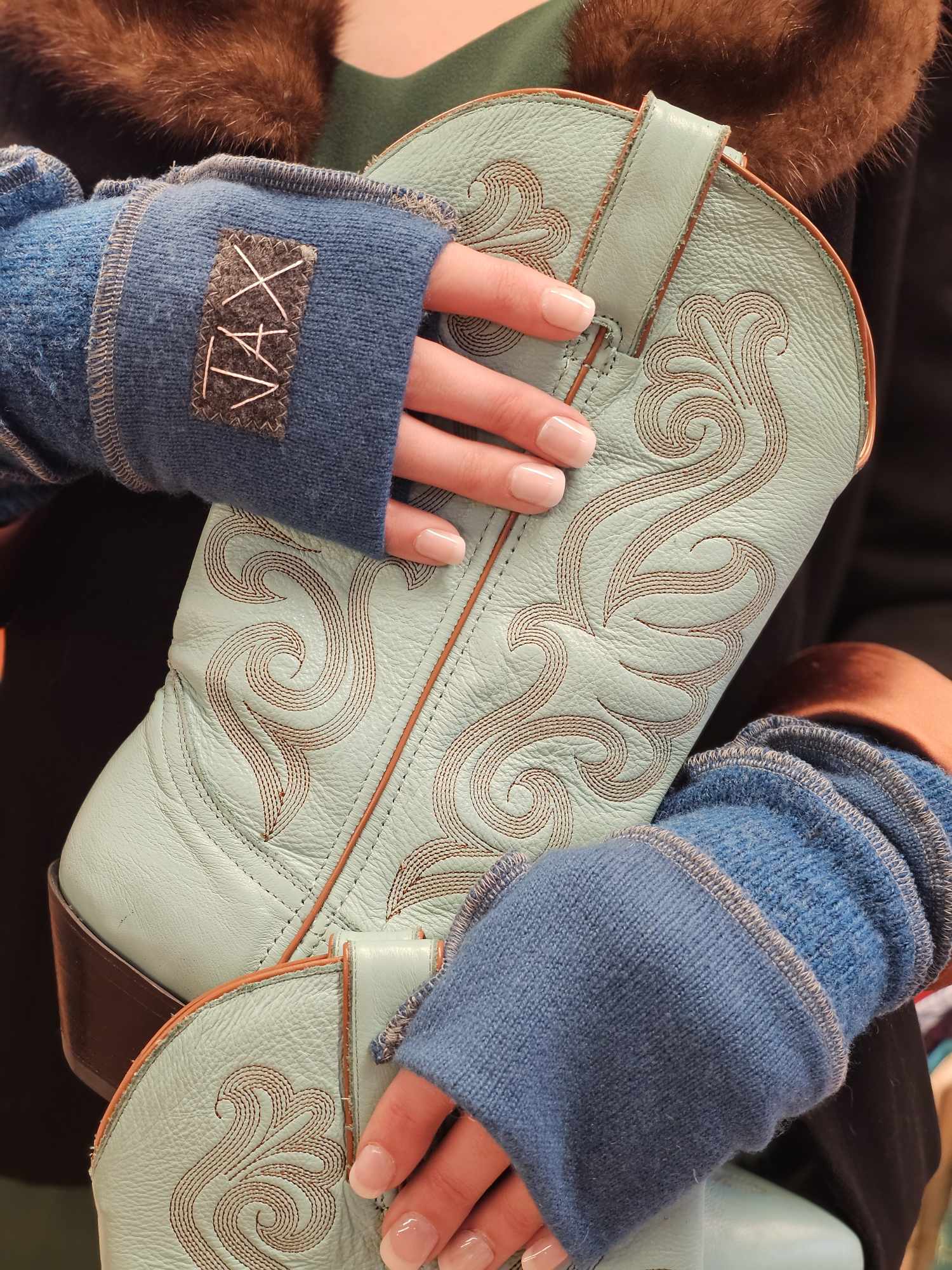 A special addition to our best seller the Fingerless Gloves. Fingerless Gloves handmade from upcycled Cashmere TM sweaters, they are extra soft and each pair of our fingerless gloves tells its own story through texture, color, and craftsmanship. They keep your hands warm while letting your fingers stay free — perfect for typing, texting, or holding a warm mug on chilly mornings.