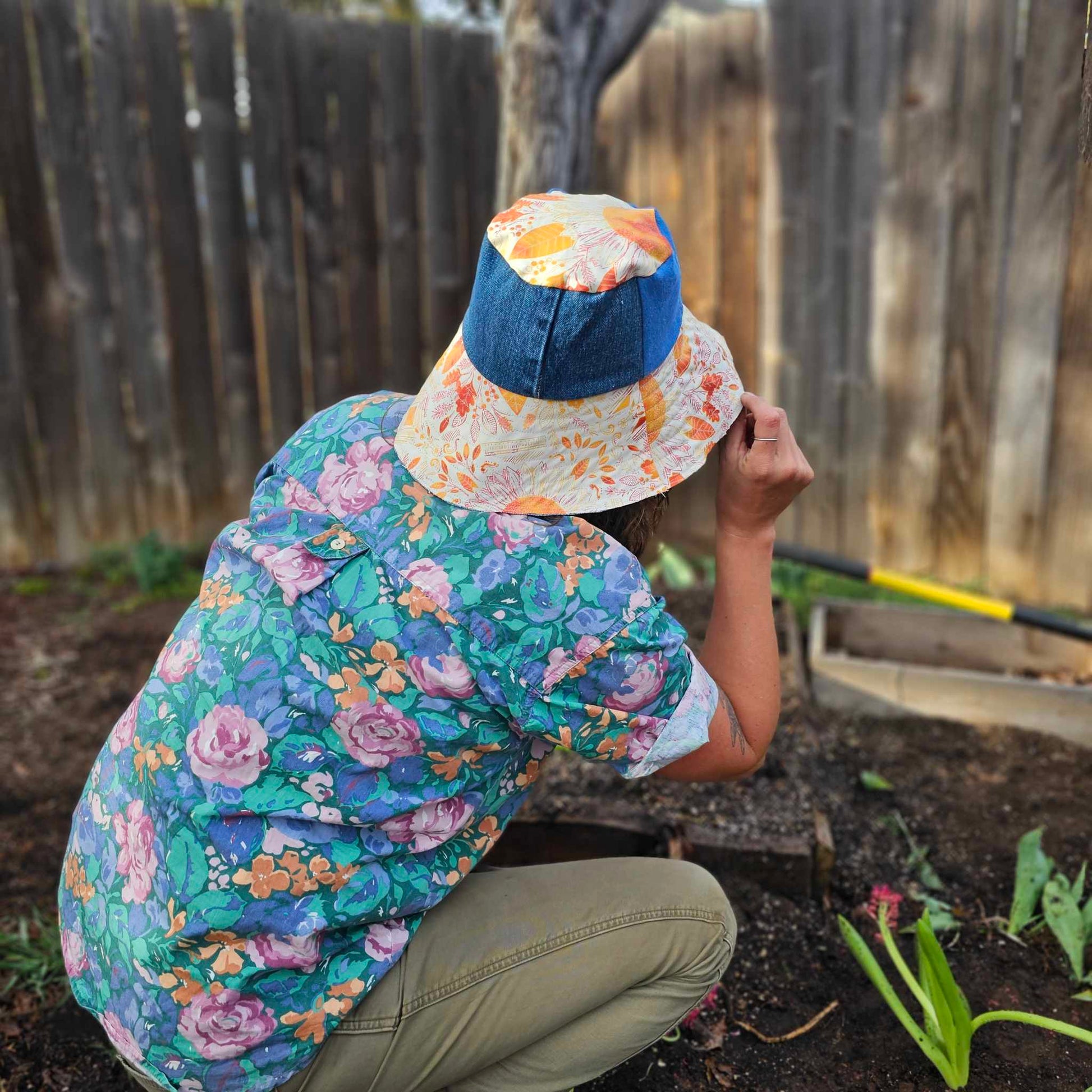 Upcycled Orange Sunflower Canvas and Mix Denim Sun Hat